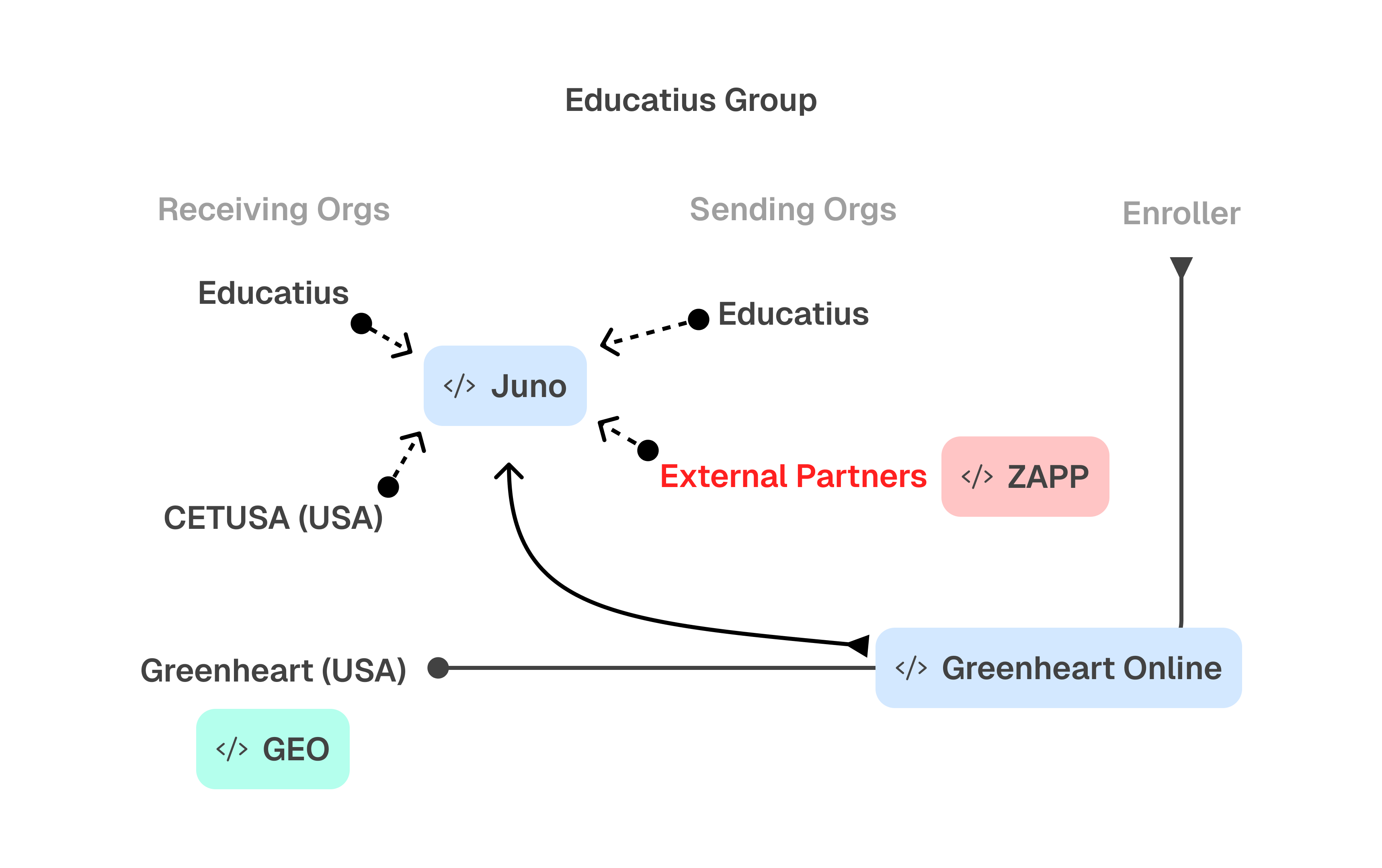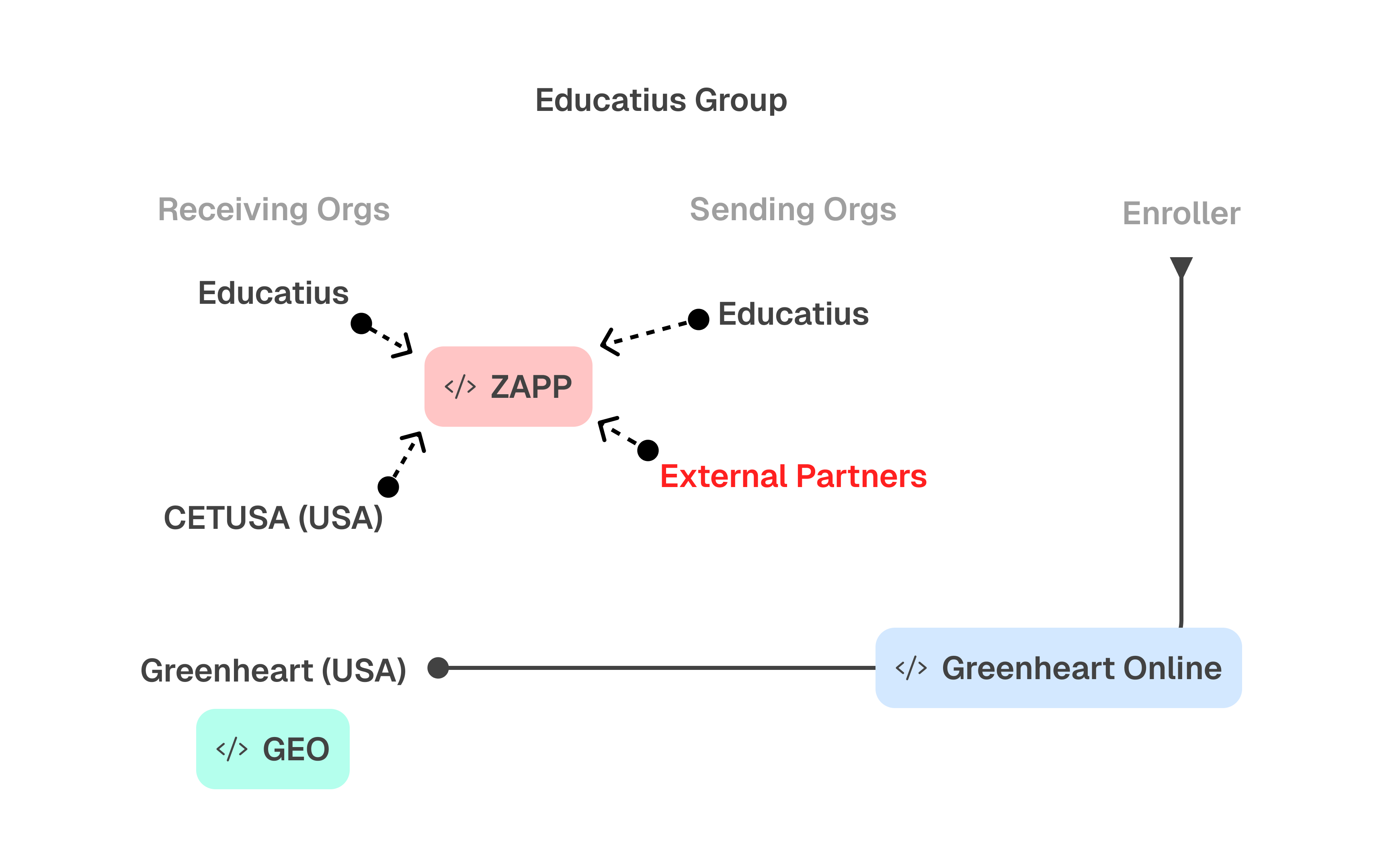 Educatius Group is a Swedish education company with multiple subsidiaries worldwide, all in the business of international exchange programmes. These subsidiaries operate as internal partners to each other - separate businesses that collaborate across the group. There are also external partners in the same industry but outside the Educatius group. Participant applications flow between all these partners throughout the recruitment and placement process.
